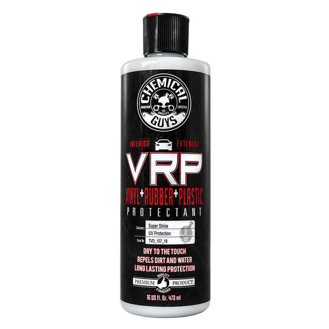 VRP Protectant is the ultimate protection and shine enhancer for interior and exterior trim. VRP creates a super shine finish on any rubber, vinyl, or textured plastic surface. The easy-to-use protectant restores a deep black look, enhances shine, and protects the surface against UV solar rays. Perfect for tires, bumpers, trim pieces, bumper moldings, side mirrors, and much more. Easily protects dashboards, door panels, vinyl seats, and steering wheels. VRP provides a brilliant shine and restores the dark black appearance to plastic and rubber trim. Apply to rubber tires to maintain the dark black finish after every wash. Restore mirror and bumper trim from dull and faded to dark and rich. VRP Protectant leaves no-residue and finishes dry-to-the-touch. VRP Protectant keeps your trim looking like new for weeks, not days. VRP penetrates deep into the pores of plastic, rubber, and vinyl to restore and protect the surface to factory-new condition. The water-based protectant creates the perfect new appearance on interior and exterior surfaces, not a greasy wet look. Restore the dark, rich shine to vinyl, rubber, and plastic trim with Chemical Guys VRP Protectant.