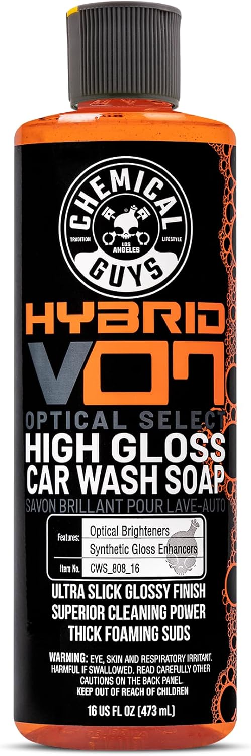Chemical Guys Hybrid V7 High Gloss Car Wash Soap is an ultra-refined optical select car shampoo that delivers superior cleaning power and the brilliant shine you've come to expect from Hybrid V7. Use Hybrid V7 Car Wash Soap to clean any car, truck, motorcycle, RV, airplane, or helicopter. Enthusiasts and detailers all over the world have come to love the lustrous optical select shine of Hybrid V7 Spray Sealant & Quick Detailer, and now we have the perfect soap to clean and maintain any car week to week. Hybrid V7 Car Wash Soap maximizes shine and optical clarity while maintaining sealants, waxes, and coatings. Hybrid V7 Soap produces thick suds and foam that carry dirt and contamination away without any harsh rubbing, scrubbing, or scratching. Hybrid V7 Car Wash Soap is pH-balanced, and will not spot or stain even when used in direct sunlight. Hybrid V7 Car Wash Soap is blended with super-slick paint cleansers, lubricants, and gloss enhancers for a scratch-free wash with tons of extra shine. Special emulsifiers lift and separate abrasive dirt and grime from surfaces for a gentle, scratch-free washing experience. Super-slick lubricants allow the wash mitt to glide over the surface and remove dirt without scratching. For enhanced shine and protection, follow every wash with Hybrid V7 Optical Select High Gloss Spray Sealant & Quick Detailer. Take your shine to the next level with Hybrid V7 High Gloss Car Wash Soap.